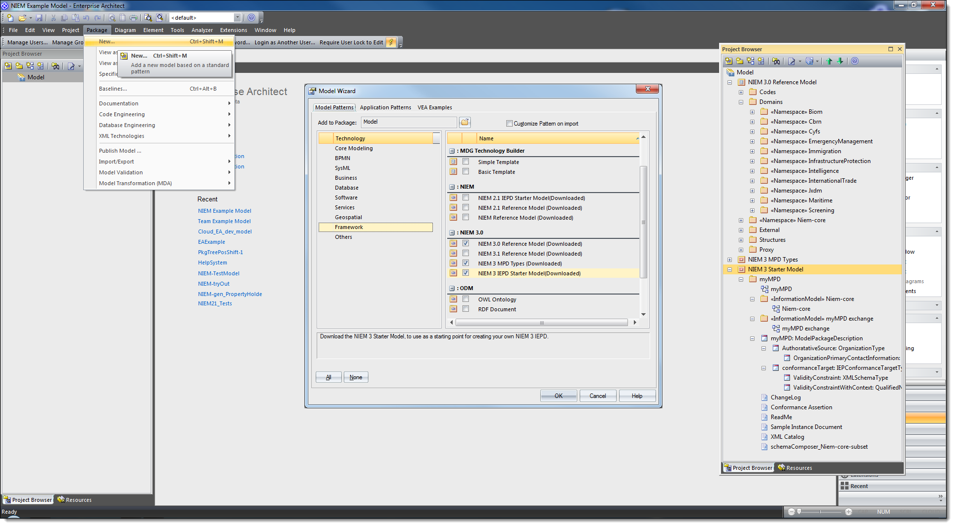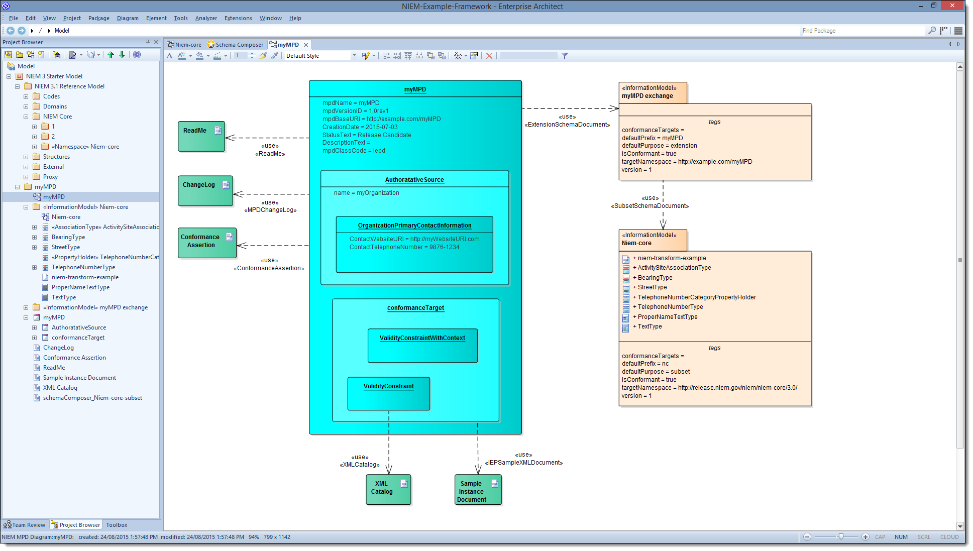 Using Enterprise Architect's NIEM capability, UML-based Information Exchange Package Documentation (IEPD) models can be generated via the built-in pre-formatted model patterns, containing base exchange files, static artifacts, metadata and catalog files as a starting point for further customization.