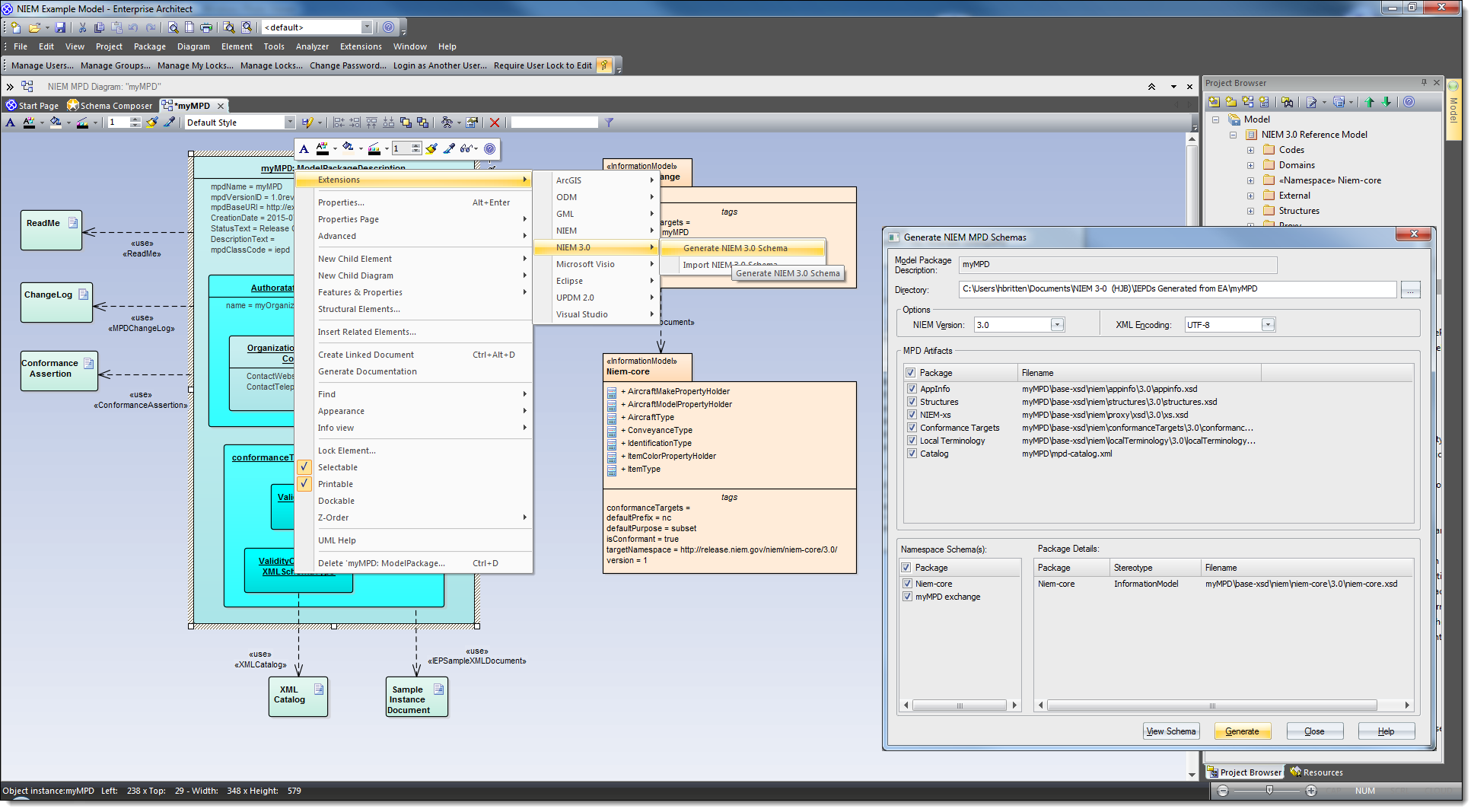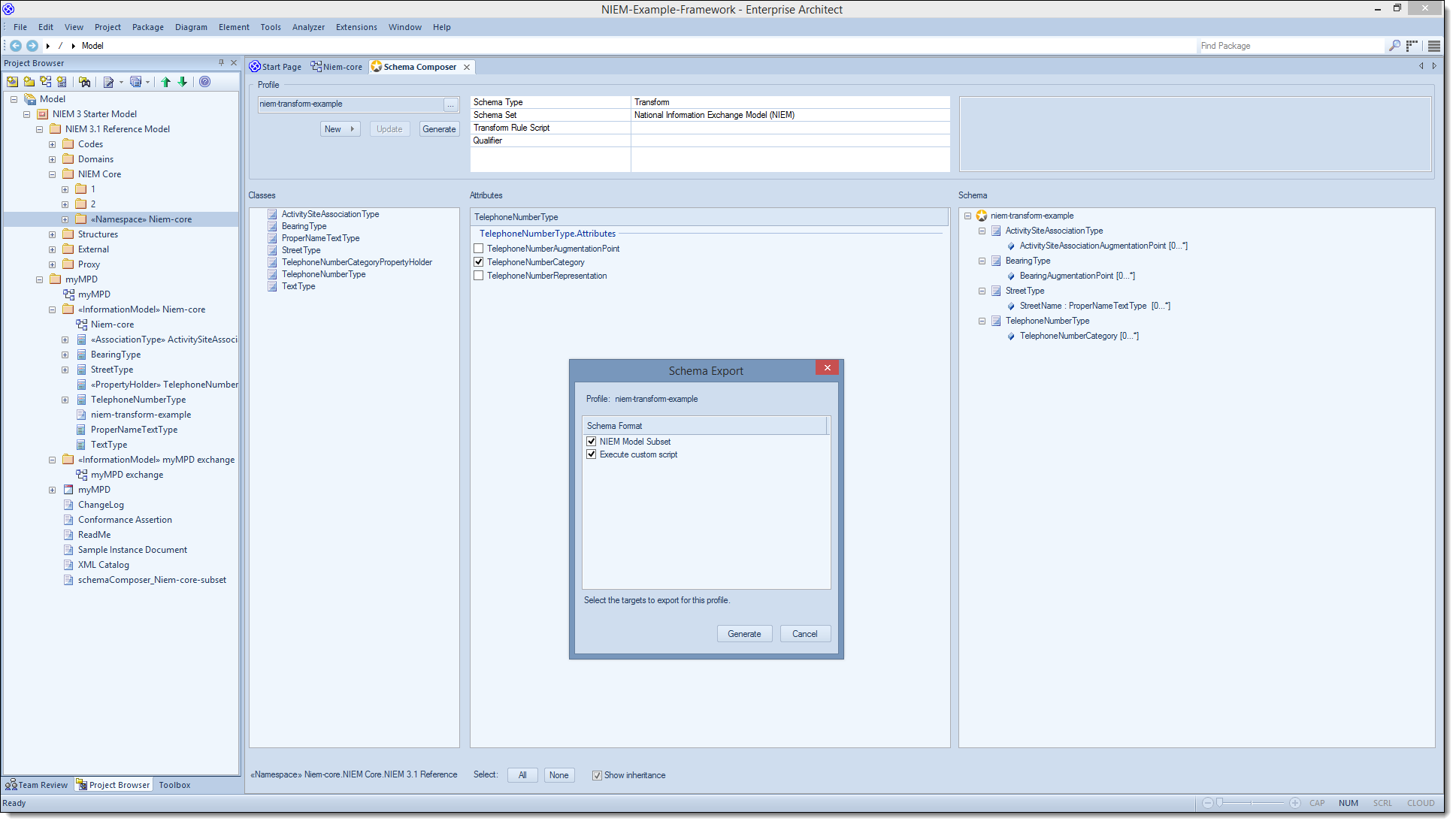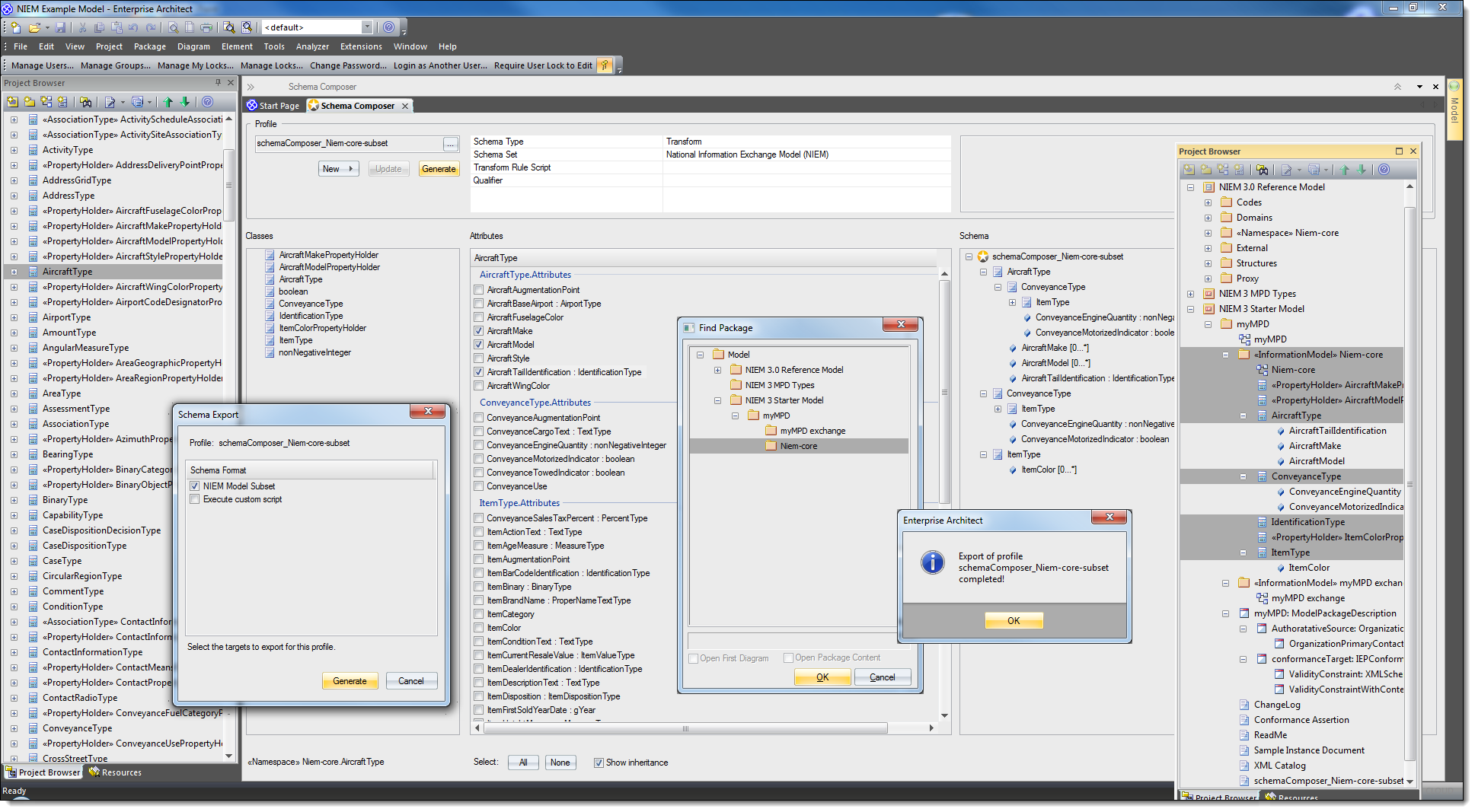Enterprise Architect also supports the importation of the NIEM Reference Schema as well as generation of a NIEM Schema from the end user's customized model.