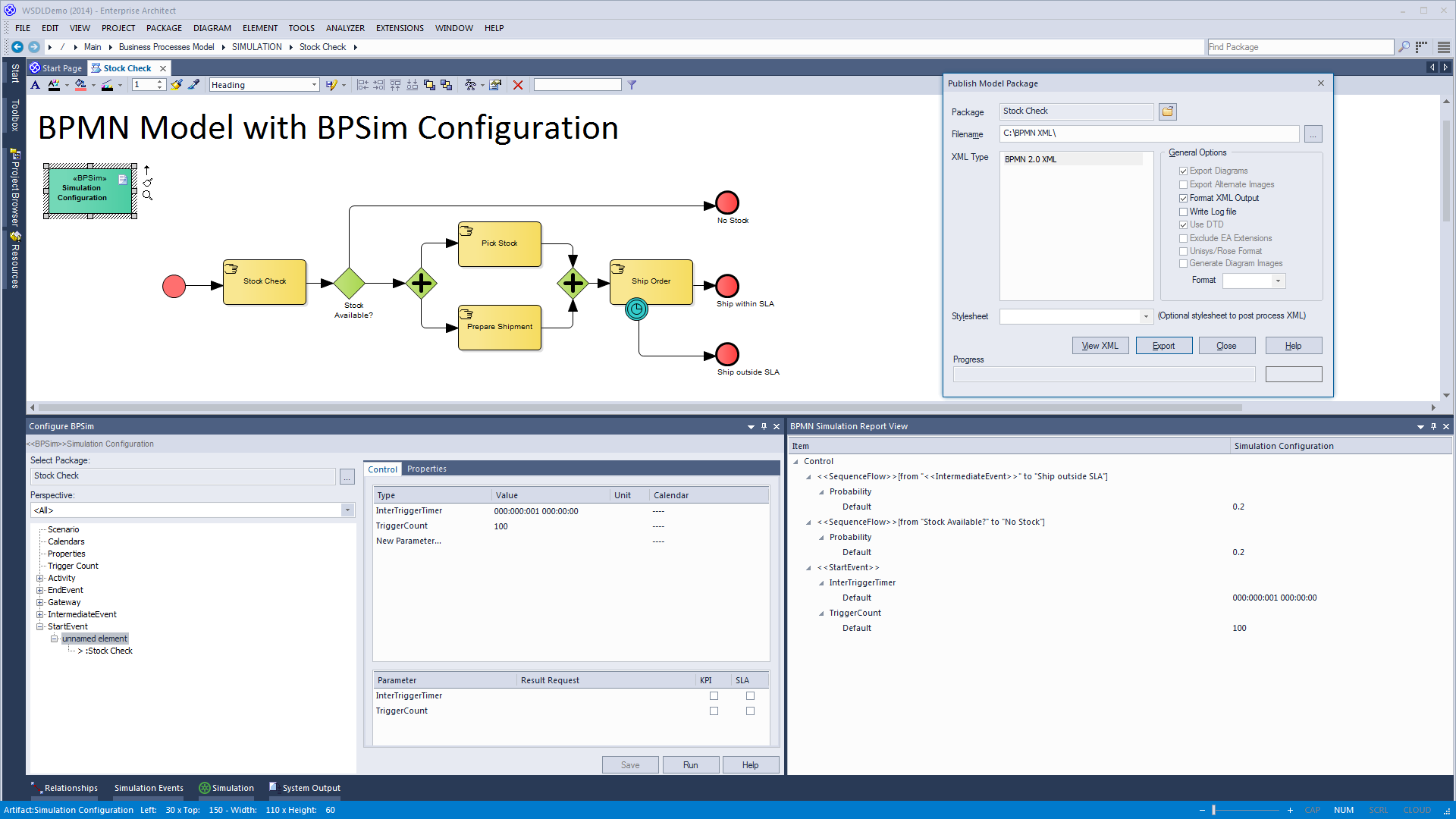 Enterprise Architect supports BPSim, a specification for parameterization and exchange of process analysis data, allowing the creation, comparison and reuse of different simulation configurations stored within the model.