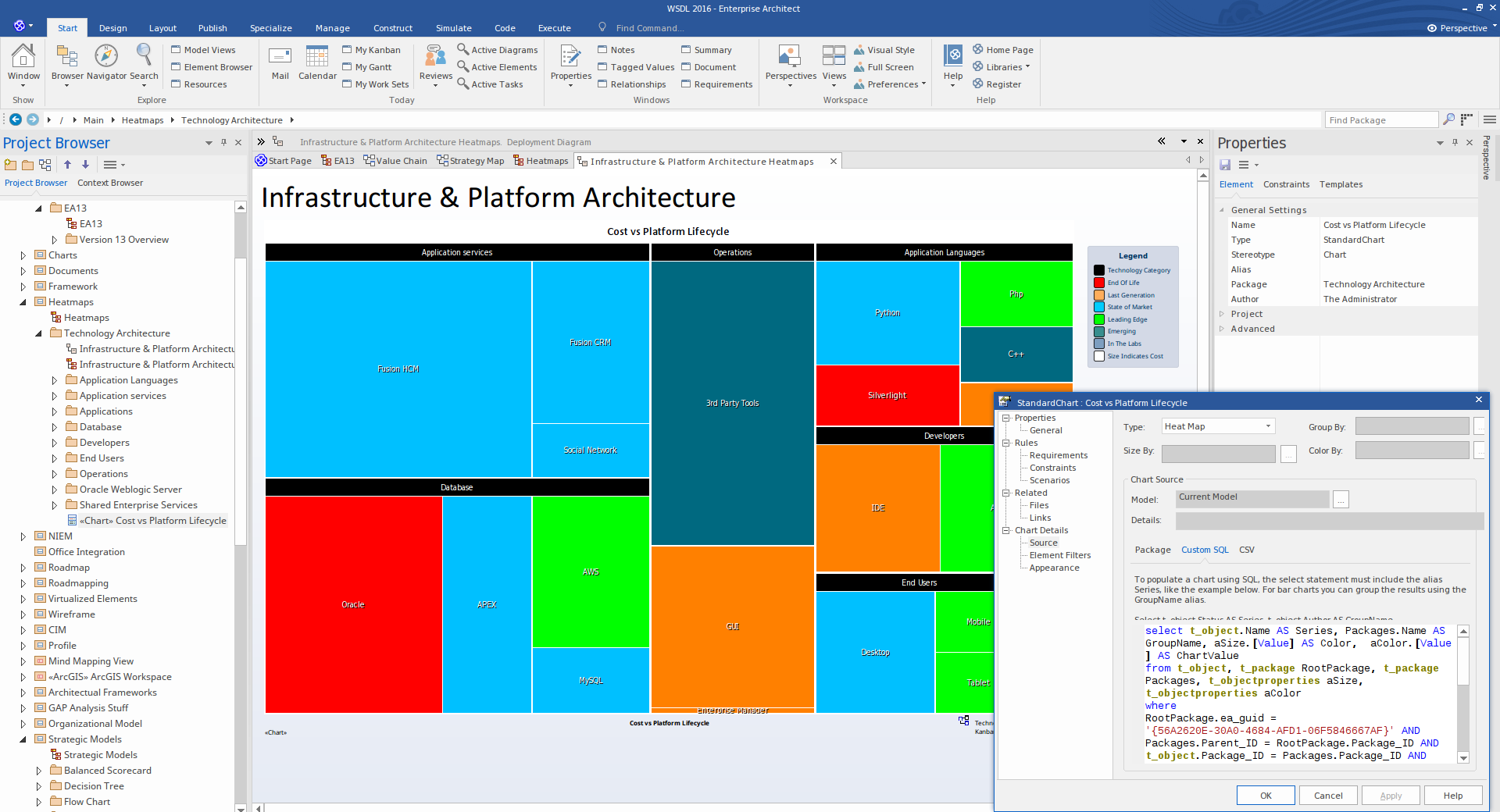 Enterprise Architect's Heat Maps analyze the enterprise-wide data influencing strategic planning and project level decision making. Use simple visual cues, such as color and relative size, to convey information that can facilitate decision making, identify risk and improve analysis on model elements.
