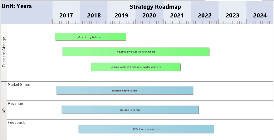 Roadmap diagrams help you to map existing elements against a Timeline. This is useful for visualizing how a system changes over time, planning a migration of responsibility between two teams, documenting the concurrent support for multiple platforms or representing just about any time based data. To ensure the modeler and viewer always have appropriate context, the Timeline is always displayed on screen, on any saved images and when printed.