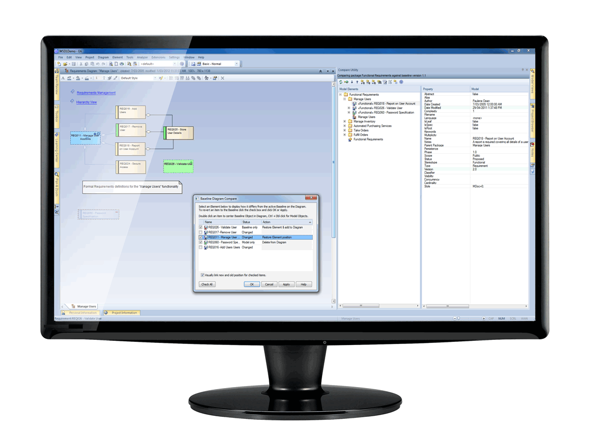 Enterprise Architect Corporate edition provides a facility to 'Baseline' (snapshot) a model package at a particular point in time. The baseline can then be used with Enterprise Architect's Compare (diff) utility to visually explore changes to the package, its elements or its diagrams at a later point in development. Differences can be merged from the baseline into the current model, allowing you to 'roll-back' changes to a previous revision of that package. Multiple users can thus contribute revisions to a package offline and later incorporate them back into the common model.