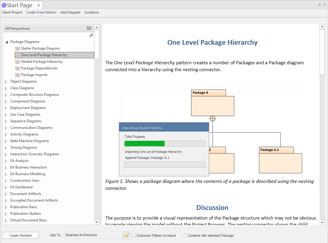 Each pattern contains useful notes, references and starter elements that together provide a framework on which you can build your model. For example, Enterprise Architect includes Java and .NET application patterns that get you started with a basic implementation model, generated code and appropriate scripts to build, run and debug your application.