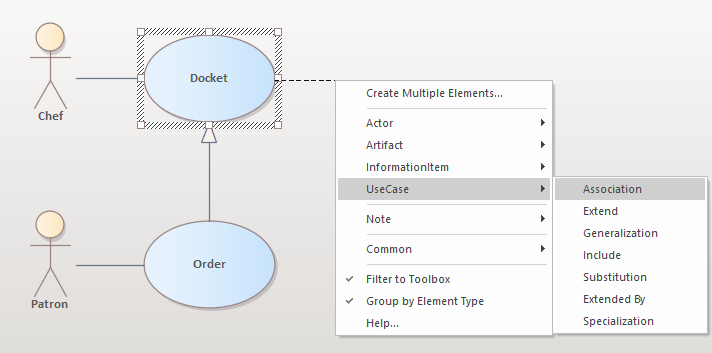 The Diagram Toolbox provides an efficient means of creating appropriate model elements or connectors and which is context-sensitive to the diagram being edited. It is also possible to switch toolsets quickly in the browser using the Perspectives function.