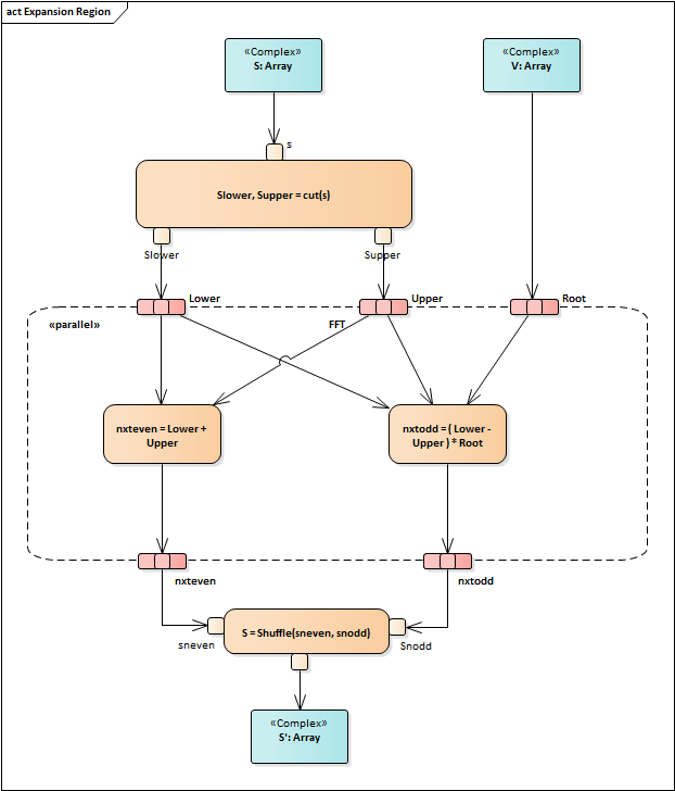 On an Activity diagram, an Expansion Region encloses a group of ActivityNodes and ActivityEdges that are to be executed several times on the incoming data, once for every element in the input collection. If there are multiple inputs, the collection sizes should match; if they do not, the smallest collection determines the number of executions. The collections must also be of the same type (such as set, or bag). Any outputs must be in the form of a collection of at least the same size as the input collection; the output collection can be larger if each execution can produce more than one output.