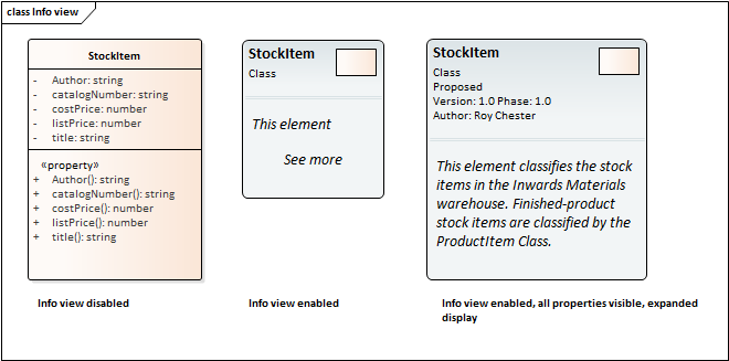 The properties listed in the top left of the element are customizable. The list defaults to show the element type and stereotype (where a stereotype exists) but you can choose to hide one or both of those properties, and to show any or all of the element Phase, Version, Status and Author. None of the last four properties are shown on the element when Info view is disabled.