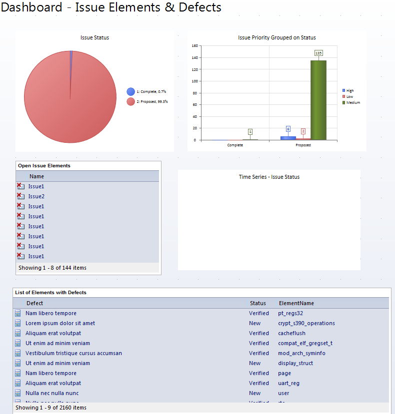 In this illustration, the 'Dashboard: Issue Elements & Defects' template has been selected from the Core Modeling technology. It generates a skeleton model in the Project Browser and a set of charts for reporting on Issues and Defects in the model, ready to key into your project structure.