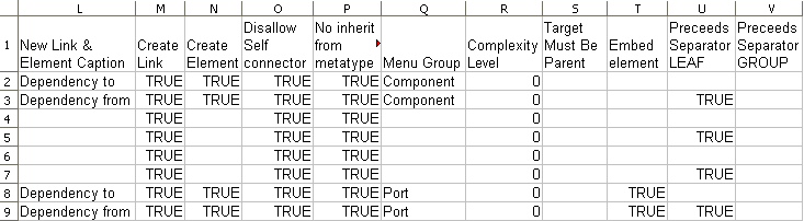 //Source Element Type,Source ST filter,Target Element Type,Target ST Filter,Diagram Filter,New Element Type,New Element ST,New Link Type,New Link ST,New Link Direction,New Link Caption,New Link + Element Caption,Create Link,Create Element,Disallow Self connector,Exclusive to ST Filter + No inherit from metatype,Menu Group,Complexity Level,Target Must Be Parent,Embed element,Precedes Separator LEAF,Precedes Separator GROUP,DUMMY COLUMN