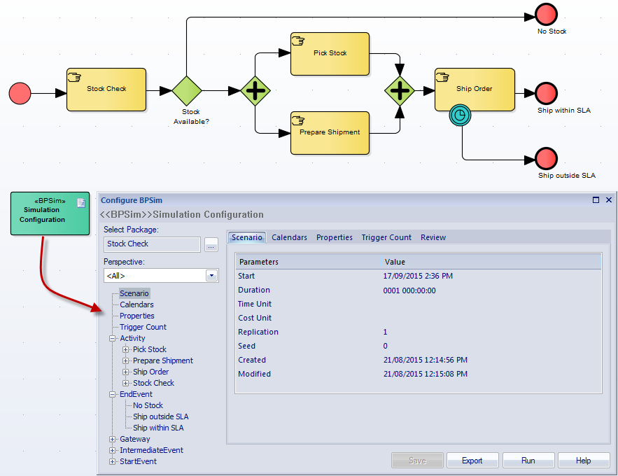 The configurations created inside the repository and the BPMN Business Process Diagrams can be exported in a standard format and consumed by any standards compliant BPSim engine. Sparx Systems sells a BPSim Compliant simulator available in the MDG BPSim Execution Engine that allows the simulation to be performed inside the tool. Simulation results can be stored in the engine and used for cross simulation comparison. |