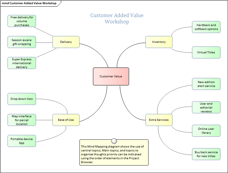 An analyst will often be required to take notes or record ideas (including their own) and information in the context of meetings, workshops and focus groups. The Mind Mapping diagram is a useful tool and its simple and appealing layout makes it accessible to everyone. Regardless of what formal languages or frameworks are being used to articulate requirements and processes and other artifacts the Mind Mapping diagram provides a diagram that requires little or no explanation.