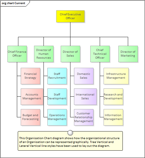 The Organizational Chart can be used to create any type of chart including: Functionally Orientated, Market Orientated or a Matrix Model chart. A number of charts could be created representing different current and future states of the enterprise. |