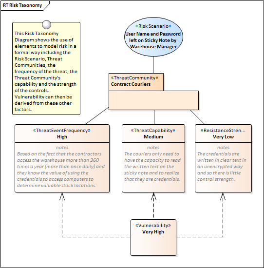 The Risk Taxonomy can be used at varying levels of formality depending on the initiatives, processes and requirements for risk assessment. The Relationship Matrix could also be used to record the relationship between the discrete values, Threat Capability and Resistance (Control) Strength to determine the derived Vulnerability. A Toolbox of elements and relationships is available for the Risk Taxonomy diagram allowing sophisticated models of risk to be created.