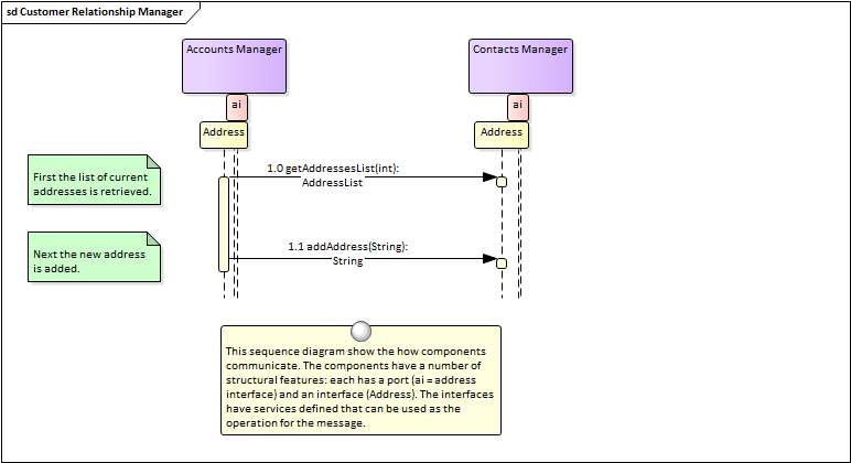 The Sequence Diagram can be used to model any set of messages that flow between two or more elements to produce a result. They are more typically used by technical modelers to depict how messages are passed between application components and interfaces to achieve an outcome. They are particularly useful when used to describe complex protocols or subsystem interactions that are difficult to understand unless presented graphically. Sequence diagrams can also be created automatically from stack traces as a way of visualizing how a system functions. |