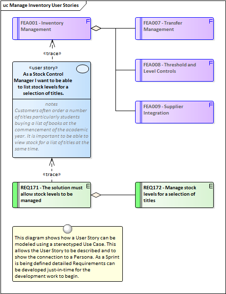 A User Story can be created using the stereotyped Artifact available from the Artifact Toolbox page or as a stereotyped Use Case. While many proponents of User Stories see them differently to Use Cases they are both aimed at defining a goal that a user in a role wants to achieve. A stereotyped Use Case can also be used to represent a User Story with just the description written in the form - As a (Stock Controller) I want to be able to... They can be defined in conjunction with Personas that help to allow analysts to empathize with the users.