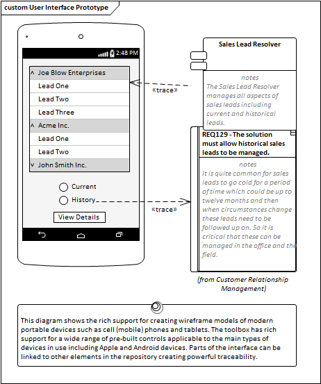 A Business Analyst or Experience Designer will typically create Wire Frame models for the devices that are being targeted in the solution. The interface elements and navigational controls can be connected to other elements in the Repository. For example a drop down list could be connected to a data source indicating the origin of the data. A slide show could also be created to walk a stakeholder through a sequence of diagrams representing the flow through a User Story or Use Case. |