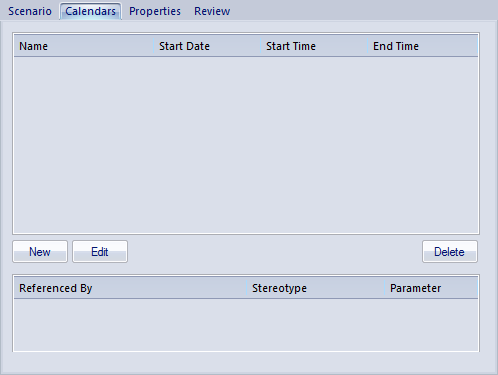 The BPSim Perspectives have four pages, or tabs, of data in common. These are the 'Scenario', 'Calendars', 'Properties' and 'Review' tabs, the first three of which are also reflected in the data hierarchy on the left of the window. The data specific to each Perspective is discussed in separate topics.