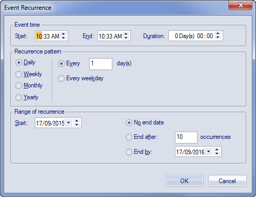- In the 'Range of recurrence' panel, select the date on which the calendar period takes effect and select the appropriate radio button to define when the period ceases to apply - never, after a set number of occurrences, or on a specific date. You can select an end date either from a drop-down calendar or using the 'spin' arrows on each segment of the date.