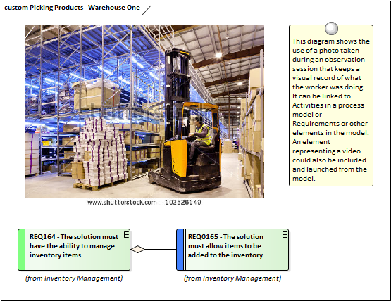 Observations are used to illicit information and provide understanding and clarification by viewing a person performing a process in its context. Typically the observations are recorded with paper notes and photography but Enterprise Architect can assist with preparing for the observation by detailing the objectives and the planning approach. The results of the observation including scanned notes and photographic images can be stored in Enterprise Architect ensuring that they are available to all modelers. The results of the observation including process diagrams and statements of how a process may be improved can be modeled in Enterprise Architect and linked to a variety of elements. Tools and material used by the process performer such as scanners and procedure manuals can also be modeled in Enterprise Architect.