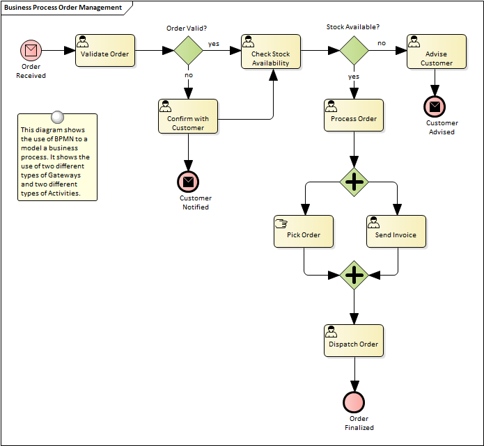 A process model can be used to model a wide range of sequential activities including business processes, system processes or even the flow through an algorithm in a programming module. Enterprise Architect supports a variety of ways to model processes including the Unified Modeling Language (UML) Activity diagrams, Business Process Model and Notation (BPMN) Business Process Diagrams and Flow Charts as part of the Strategic Diagramming set. These can be drawn at any level and drill down functionality is provided allowing a modeler to click through from a high level diagram such as a value chain down to the task level representations. The process elements can be linked to a wide range of other elements including: Business Rules, Polices, Standard Operating Procedures and Use Cases or User Stories.