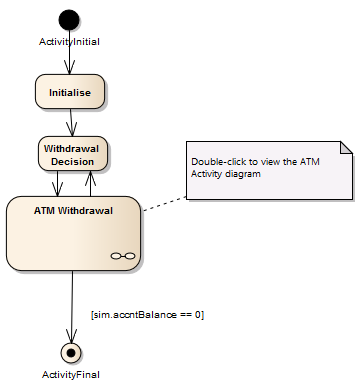 The ATM Withdrawal Activity is a Composite element. If you double-click on it, you open and display the child diagram, which is a more detailed breakdown of the withdrawal process. Similarly, a simulation will open and process the child diagram.
