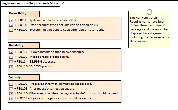 Quality Attributes are often grouped into sets such as those pertaining to Security or to Performance or one of the '-ilities' such as Reliability. A requirements Package can be used to group these elements together which provides a convenient categorization for reporting. The Packages can be seen in the Project Browser and can also be added to a diagram with the option to display the individual Requirements inside the Package.