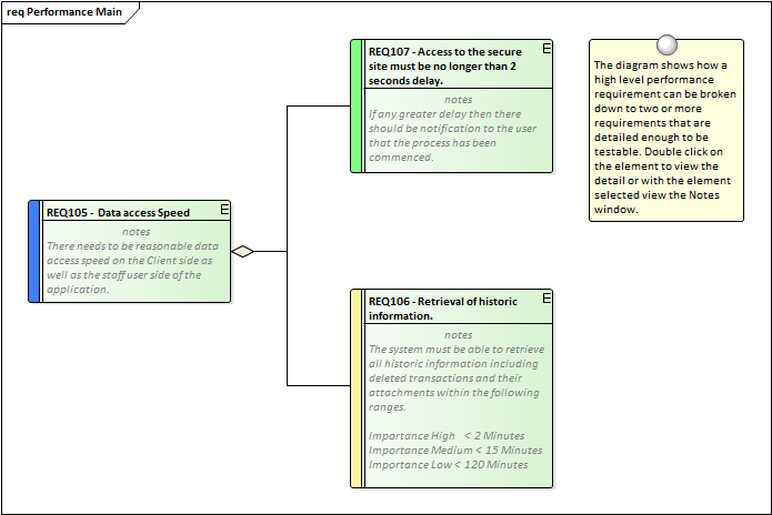Enterprise Architect conveniently has a number of Requirements such as the Non Functional, Architecture, Implementation and Security Requirement types available from the Extended Requirements page of the Requirements Toolbox. These can be dragged onto a diagram or created directly in the Project Browser or Specification Manager.