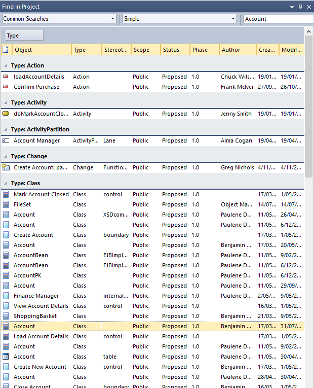 Quickly browse element usage across all diagrams. Perform powerful element searches using sophisticated queries. |