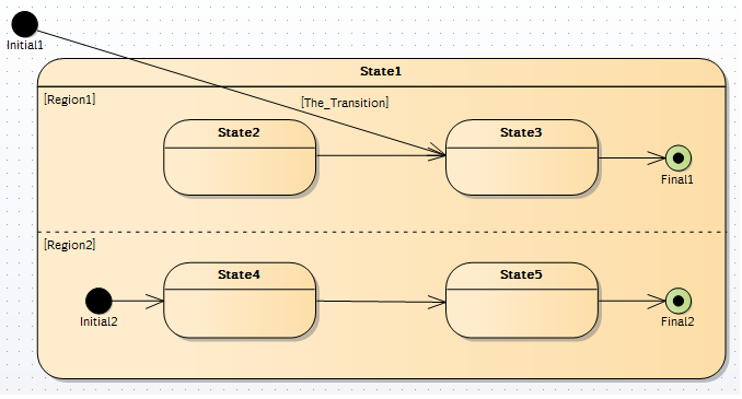 When a State is activated, all regions within the State which can be activated, will be. A region can be activated if there is an Initial element, or if there is a transition from outside the State into one of the region's States. All activating regions run in no particular order.