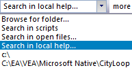 The Search window maintains a history of the file paths you have explored, helping you to quickly return to frequently-used folders in your file system. You can similarly select a previously-used search string, if you need to repeat a search several times. When you are searching code files, you can also confine the search to files of specific types, by selecting the file extensions, and to include just the selected folder or all of its subfolders as well. Another useful facility is being able to select to show the results of the search as either a list of every instance of the string, or a list of files containing the string with the instances grouped under the file in which they are found.