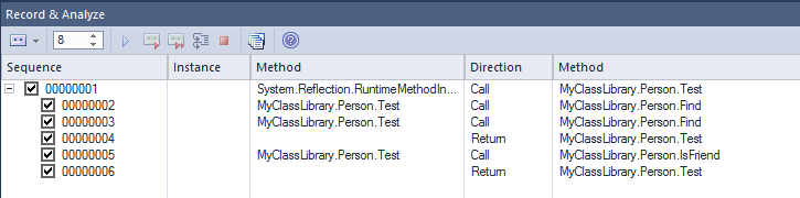 While you are working in the Workbench, you may wish to produce a sequence diagram for one or more methods you have be developing or investigating. This can easily be accomplished. The same features of Enterprise Architect's Execution Analyzer are available in the Object Workbench. You might even begin a Workbench session by recording a sequence diagram first off, as a means of visualizing what you plan to work on.