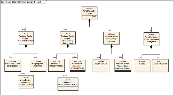 This diagram shows an example Design Model for a Portable Audio Player; the SysML Block Definition Diagram describes the Portable Audio Player as a composition of various reusable off-the-shelf subsystems and in-house designed ones.