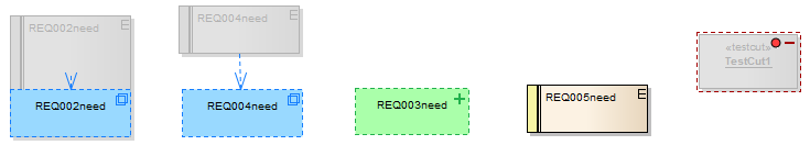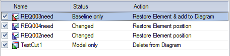 Click on the checkbox against each required item (or click on the to select every item). The 'Action' column displays the action required to roll each element's relationship to the diagram back to the Baseline relationship, and on the diagram the selected elements are represented as shown: