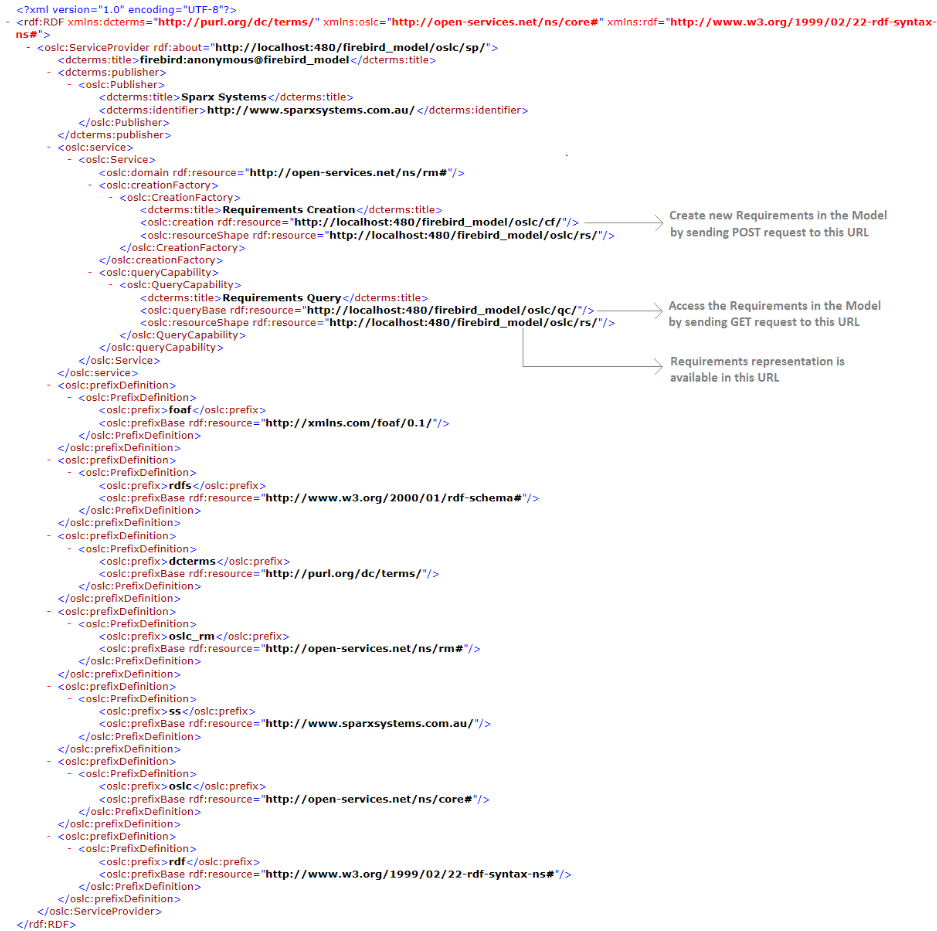 Enterprise Architect acts as an OSLC Provider that other OSLC-compliant tools (OSLC Consumer/Clients) access to link to its Resources. All OSLC Resources live in a Service Provider, which is a central organising concept of OSLC. In Enterprise Architect, each model that can be accessed via the Cloud connection is treated as an OSLC Service Provider. The Requirement elements in the model are the OSLC Resources.