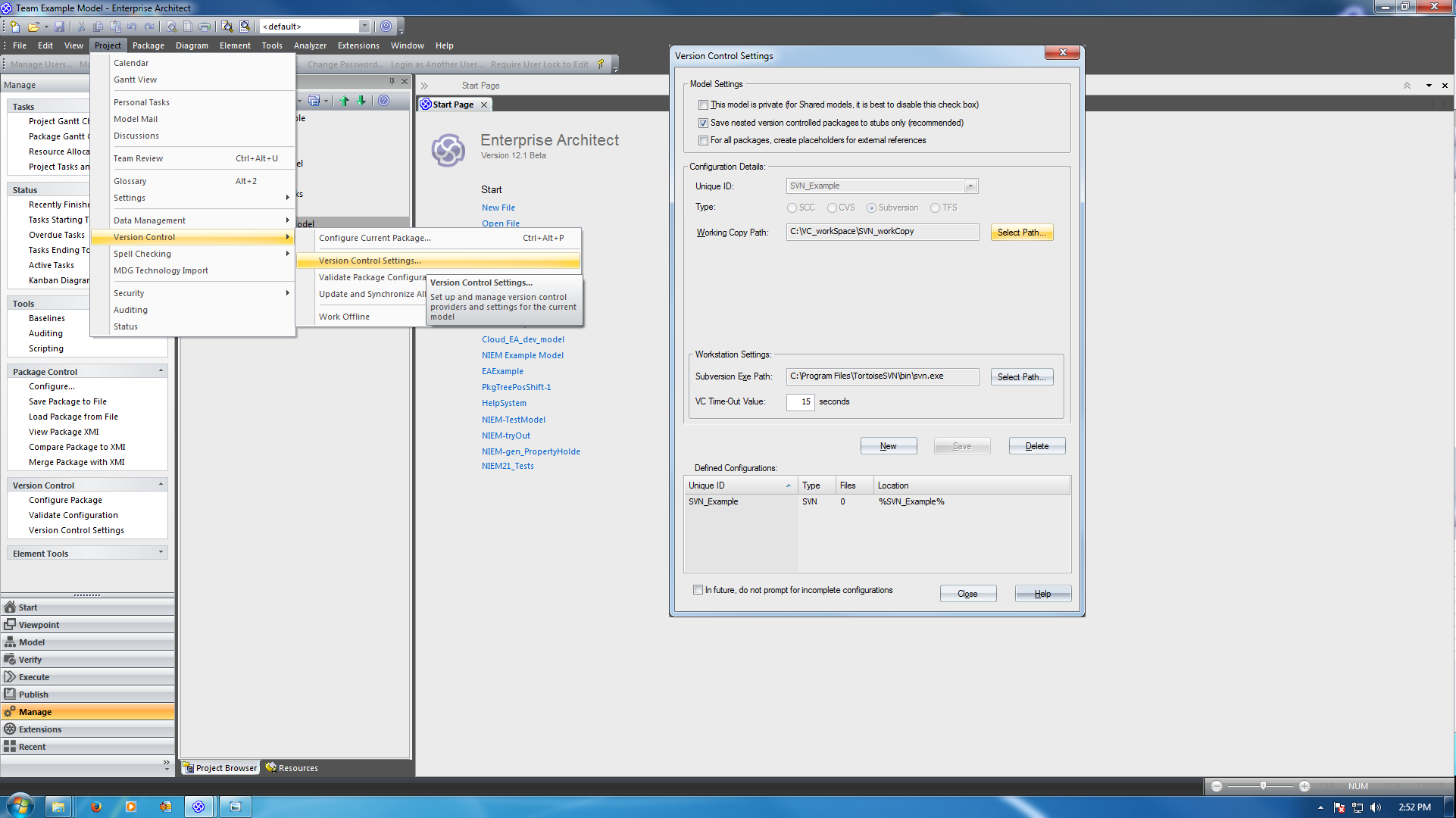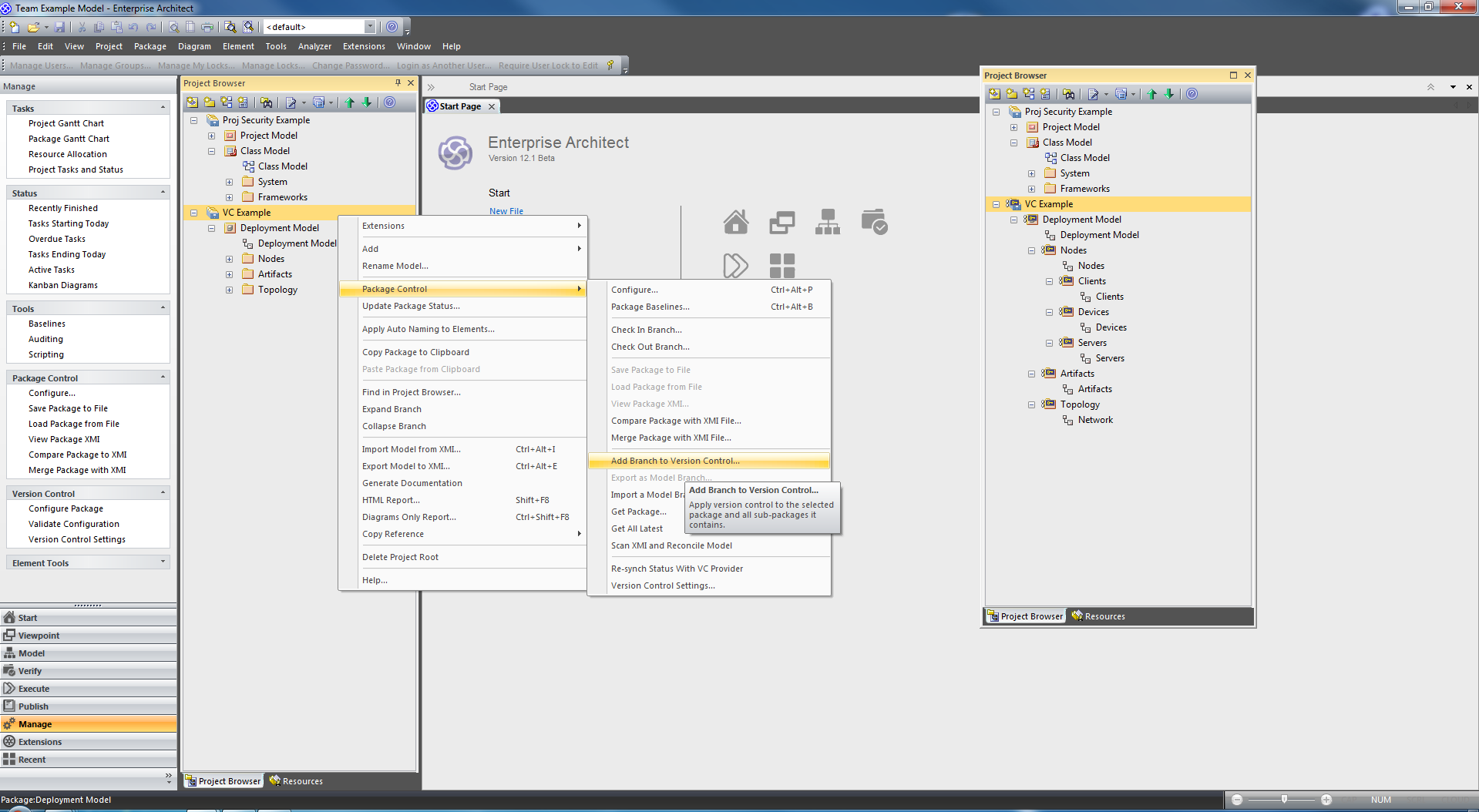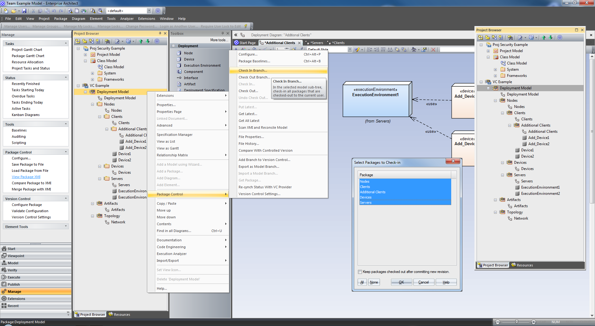 Within Enterprise Architect, you can manage changes to and revisions of your projects by placing individual model Packages, view nodes or root nodes under version control. Version control provides numerous key facilities, including:
