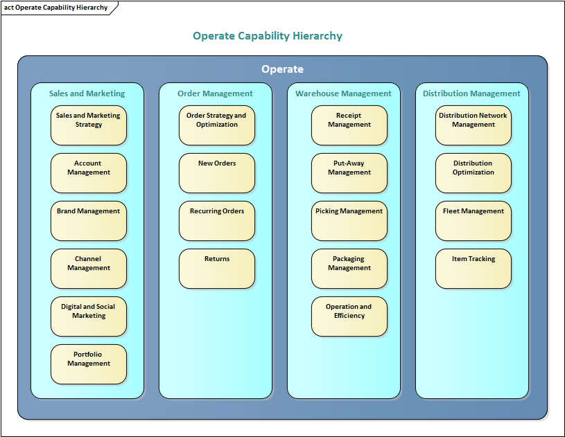 Enterprise Architect allows Capabilities to be modeled using the UML extension mechanism of stereotypes. Like any text based element the Specification Manager can be used when working with the Capabilities and provides a compelling spreadsheet or word processor like view that is appealing to many business people. Capabilities are usually created in a hierarchy that allows high level capabilities to be decomposed into more granular elements usually down to three levels. The Capabilities can be viewed in a diagram where the hierarchy can be visualized using nested elements that can be colored to create visual appeal and printed onto large format paper in A1 or A0 to create an eye-catching poster. The capability stereotype can be hidden using the diagram properties making the diagram more appealing.