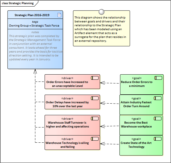 Enterprise Architect has support for modeling both strategic and tactical drivers with the use of a stereotyped driver element that can be linked to goals and other organizational elements to show how the organization must respond.