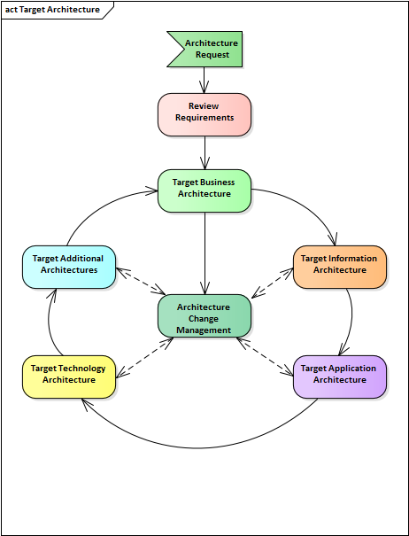An architecture process or method is required to prescribe the way architectures should be developed. Not all frameworks provide a defined process and leave it up to an organization to create and configure their own process. Enterprise Architect can be used to define a process at any level of detail and using the drill-down to child diagram feature more granular aspects of the process can be elaborated. UML Activity diagrams can be used to create a suite of diagrams that express the process of architecture creation including the processes, the tasks, the inputs and outputs and the people that perform the various steps in the process. Enterprise Architect also has an extension called the Software Process Engineering Metamodel (SPEM) that can be used to define the process with great rigor if required. In most cases the UML Activity Diagram will be sufficient to create a detailed process.
