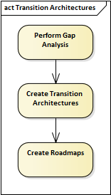 Transition Architectures are the stepping stones from a baseline architecture to a final target architecture and are theoretically target architectures themselves. They represent the practical steps from a current state to some aspired to future state and will often be represented as projects or phases in a project at an implementation level.