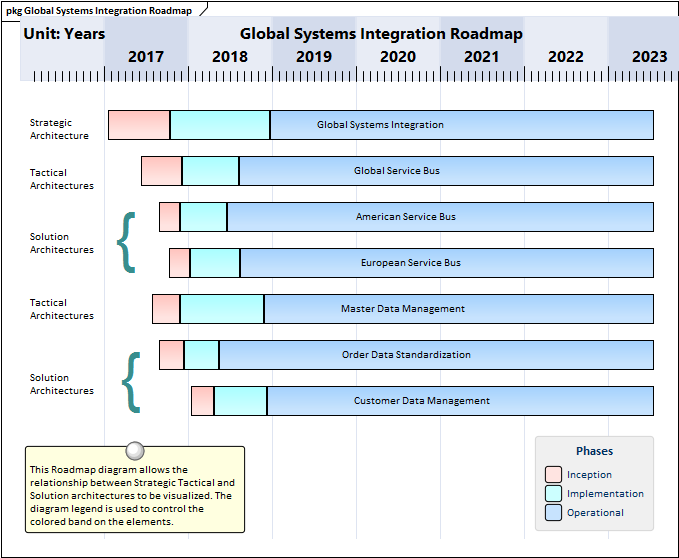 Enterprise Architect has some useful features that can help with managing time including the Roadmap overlay that allows a time scale and extent to be defined and can indicate the phases any element passes through set against the backdrop of that timescale. The tick spacing can be set from days up to years allowing any time extent to be represented. Any architectural elements can be represented on Roadmap diagrams including architectures themselves, principles, capabilities, applications, information, and technology devices and more.