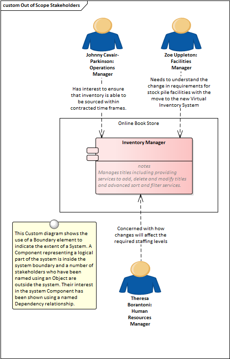 Many of the stakeholders will be managers or non technical staff who will benefit from viewing diagrams with graphics. Images from the standard Image Library could be used or an organization is free to create their own graphics to represent individual stakeholders or stakeholder groups.
