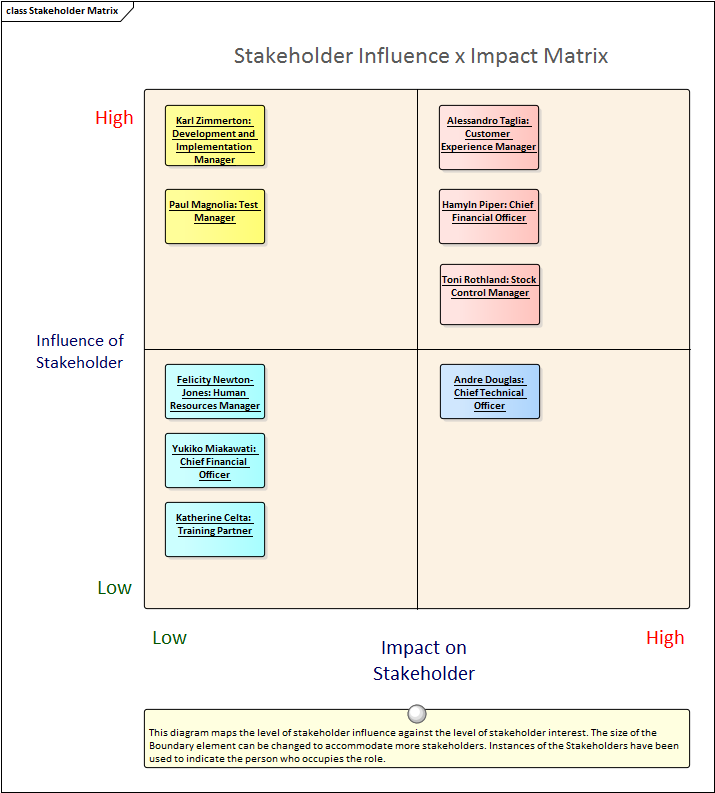 A Relationship Matrix can be used to present a number of views of the stakeholders. The matrix is a spreadsheet like view that is often more appealing to many managers and non-technical audiences. Any number of matrices can be created that relate stakeholders to other models elements including other stakeholders.