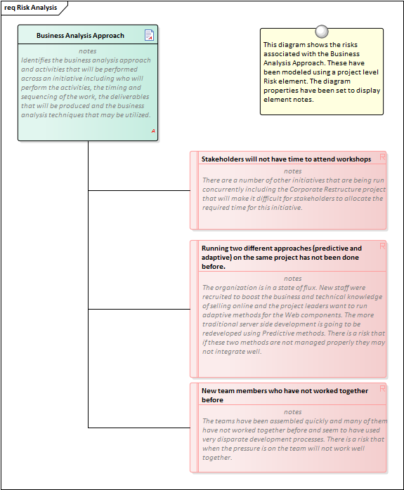 Enterprise Architect supports the modeling of risks at the project or the element level. A project manager or senior analyst will typically define risks at the project level, whereas a business analyst, while they might assist with project risks, would typically record risks at the level of requirements and modular units of the system such as components.