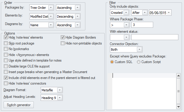 There are several options that can be set to tailor the information that is included in a generated document, including the ordering of elements and diagrams and hiding certain elements. Filters and word substitutions and other options can also be applied.