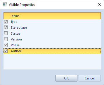 The properties that are displayed by the Info View representation can be configured to make the element more meaningful to particular audiences. The Visible Properties windows allows properties to be selected for display.