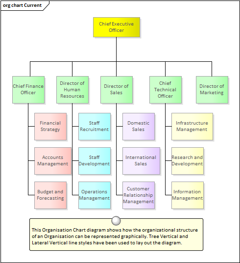 The Organizational Chart can be used to create any type of chart, including a Functionally Orientated, Market Orientated or Matrix Model chart. A number of charts could be created, representing different current and future states of the enterprise. |