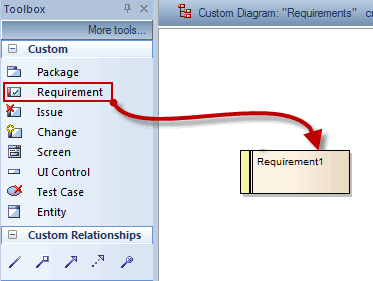 Click on the appropriate icon in the Toolbox to select the type of element to create (in this example, the Requirement element). The element type is highlighted in the Toolbox. |