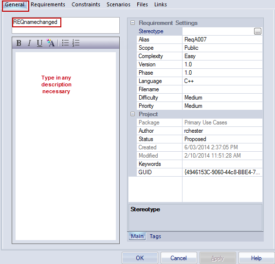 Models are constructed from elements, each of which has its own meaning, rules and notation. Generally, when you create a new element in your model, you want to use that element on a diagram. The simplest way to do this is to create the element directly on the diagram. In this procedure, we will use a Requirement element as the example.
