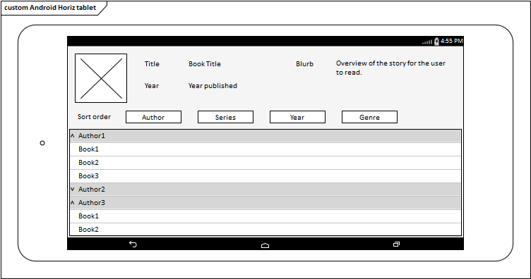 Generates a frame for the Android Tablet you are modeling. A prompt displays for you to specify portrait or landscape orientation. Child controls will be contained within the area of the screen. Tagged Values: