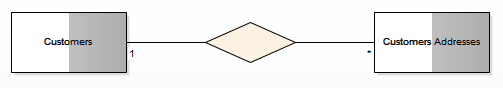 Using Entity-Relationship (ER) notation, we represent the data concepts 'Customers' and 'Customers Addresses' as Entities with a 1-to-many relationship between them. We can represent the exactly the same semantic information using UML Classes and Associations.