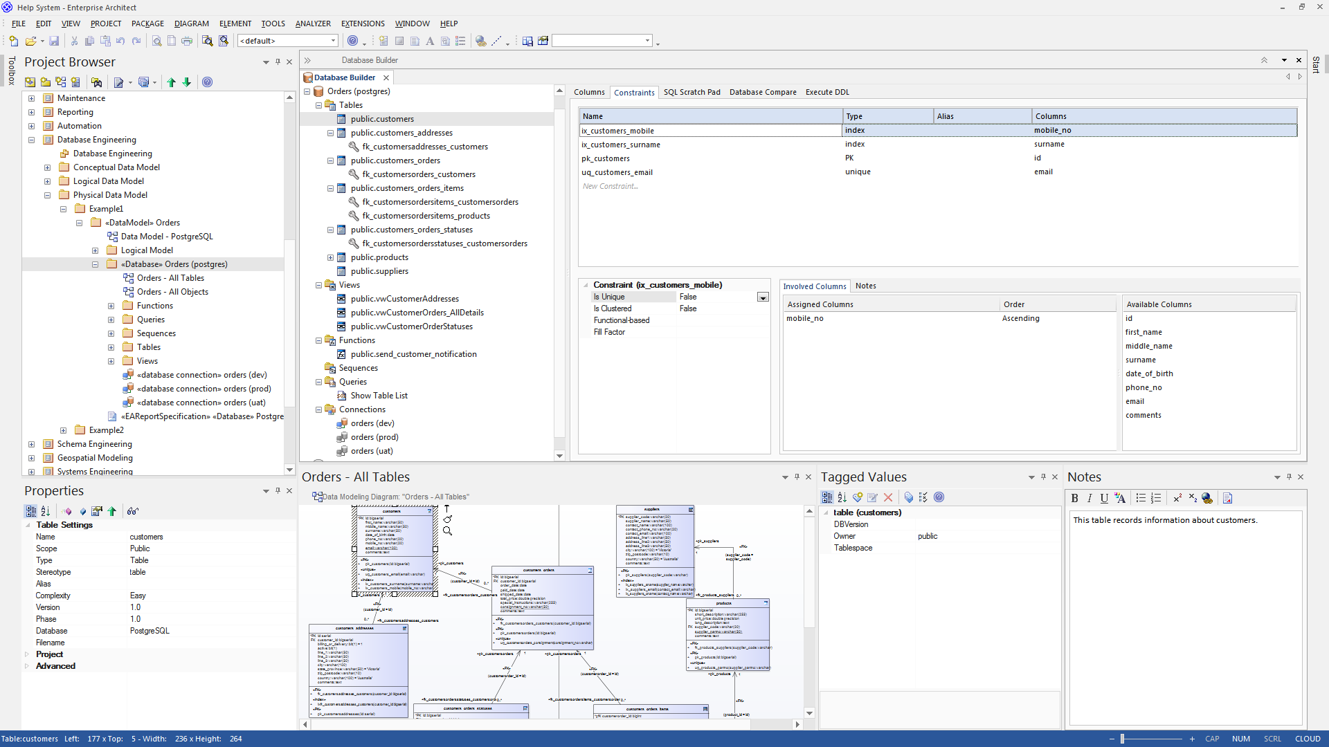 This figure shows the Database Builder loaded with the 'Orders (postgres)' data model as it appears in the Example model.